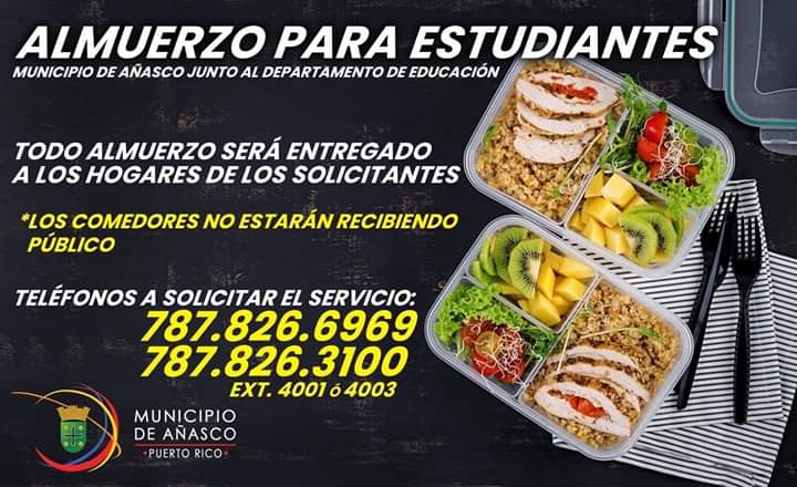 Atención a todos los estudiantes de nuestro pueblo de Añasco, se estará brindando servicio de almuerzo a las casas.